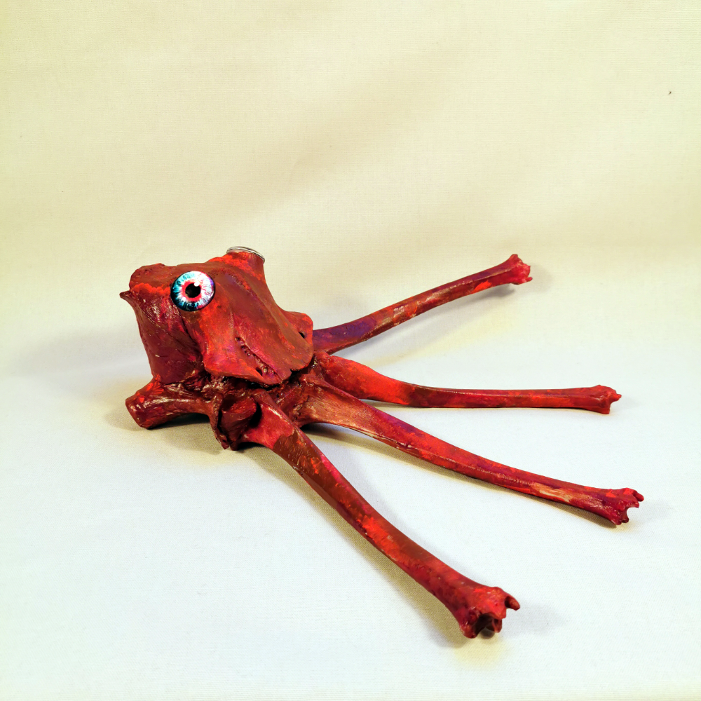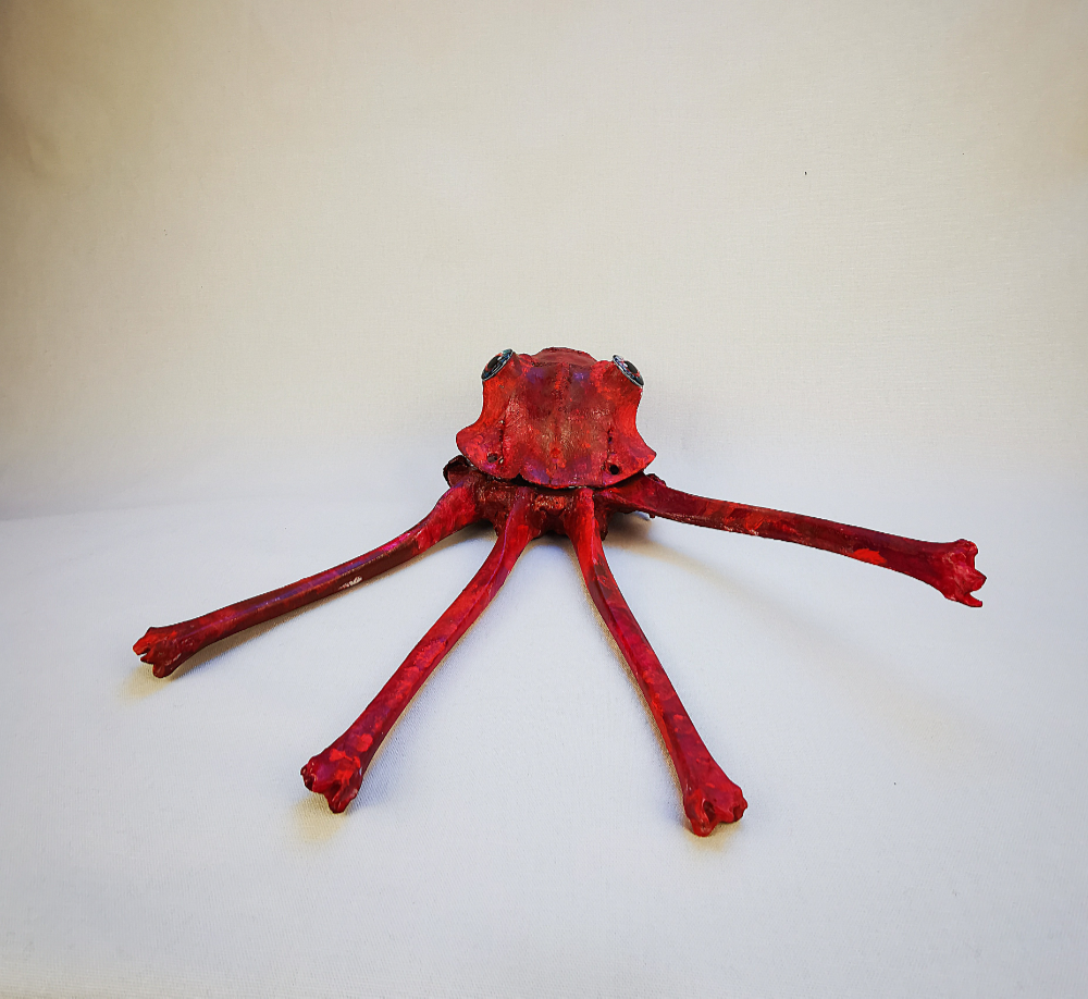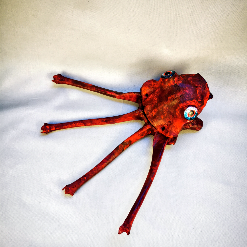 Fabelwesen Oktopode  Tierskulptur aus rot lackierten Rinderknochen. Länge 40 cm, Breite 40 cm, Höhe 12 cm.
