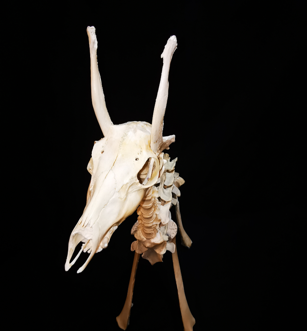 Fahles Pferd ist inspiriert von den vier Pferden der Apokalypse.  Gefertigt habe ich das Unikat aus Knochen von Rind, Hirsch und Reh, der Unterkiefer ist vom Koyoten aus ethischer Taxidermie. Das Innenskelett von diesem bizarren Rippnstickl besteht aus Metallstangen. Das fahle Pferd ist ein Unikat , welches in jedem Raum seine skurille und auffällige Präsenz zeigt. Nur für Innenräume oder unter Dach geeignet, da naturbelassene Knochen bei starker Witterung verfärben können.