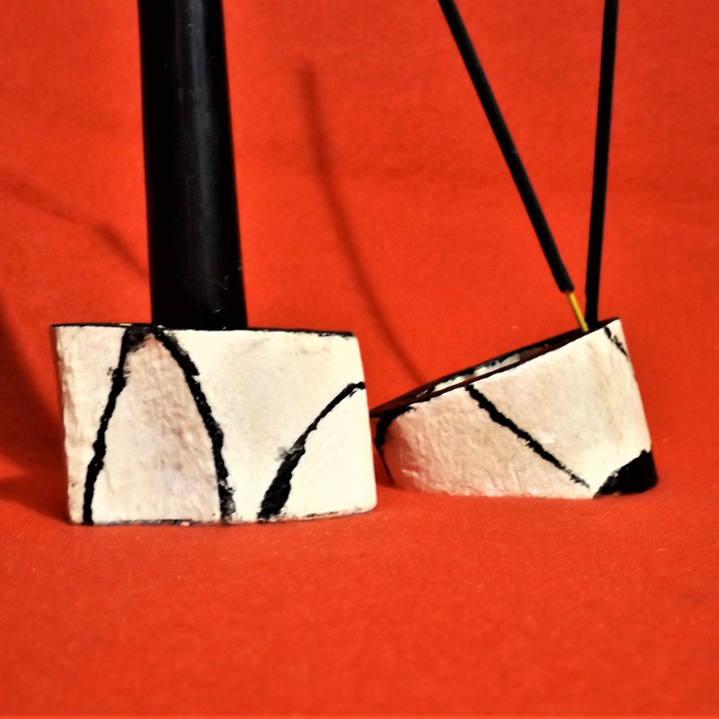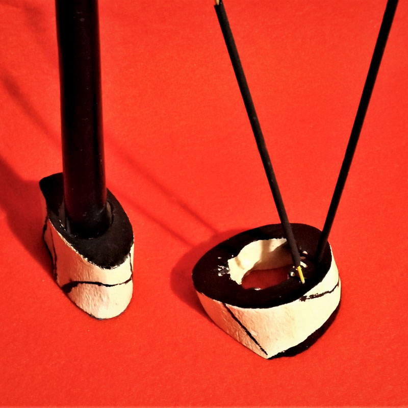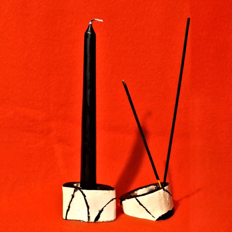Kerzenständer D 20 Set mit Räucherstäbchenhalter. jedes Teile ist 3cm hoch und 5,5 bzw. 6cm breit. der Kerzenhalter ist unten abgedichtet, um auslaufendes Wachs zu verhindern.