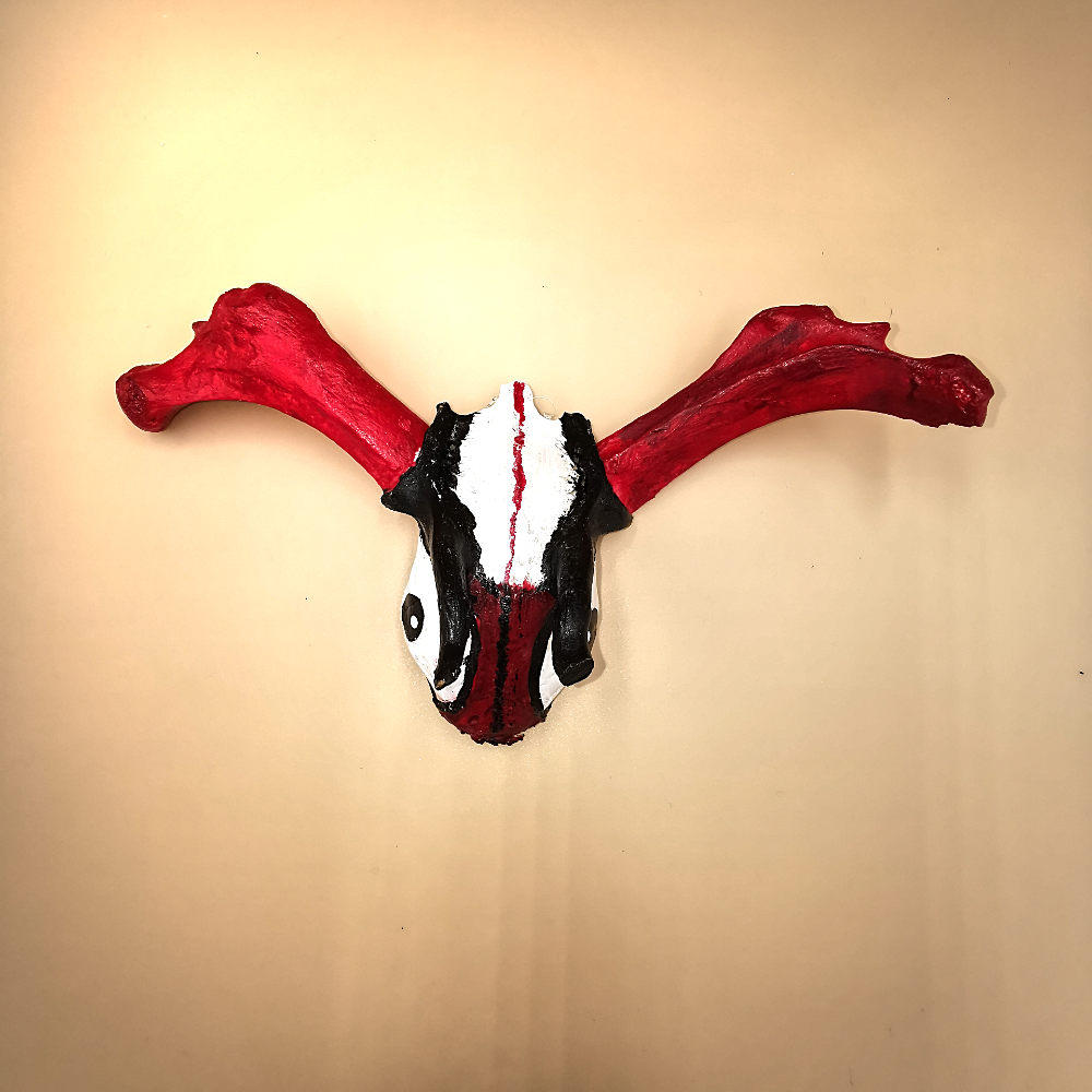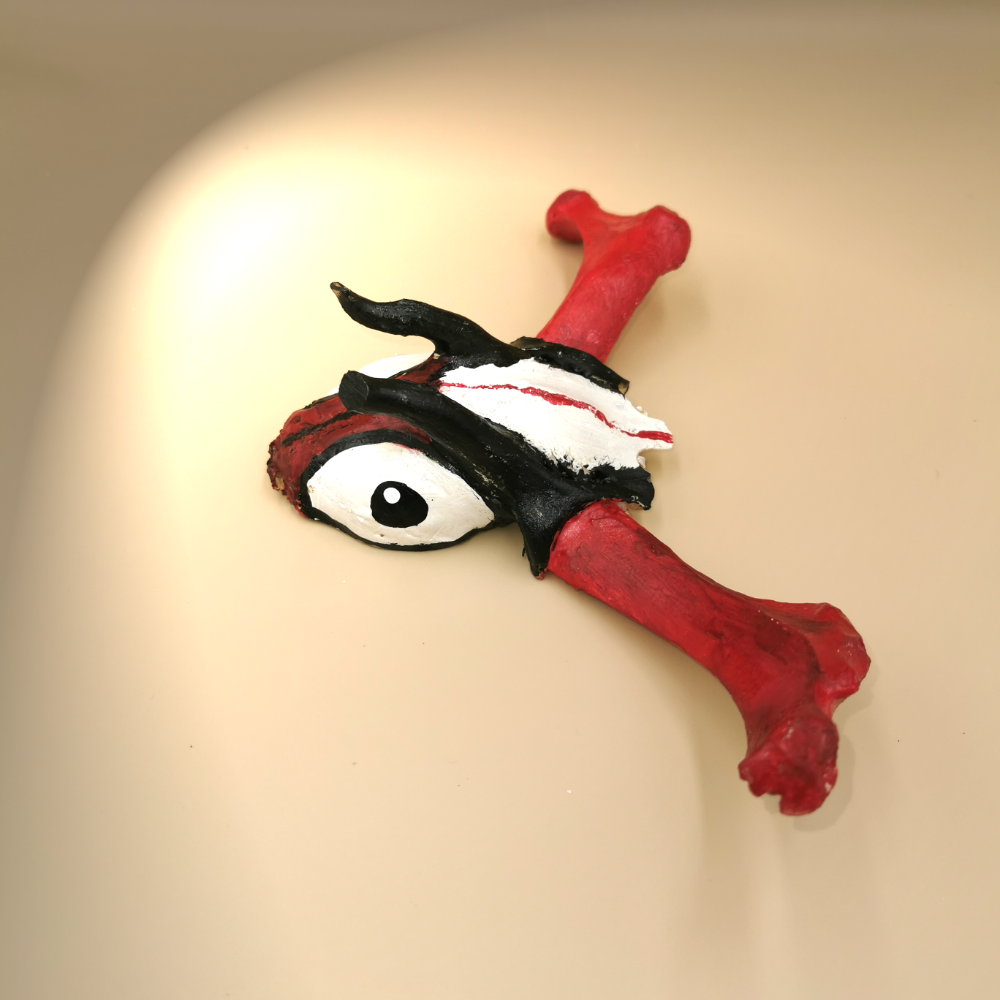 Alberich R 46 originelle Dekoration aus weiß ,rot, schwarz lackierten Knochen. 24 cm breit, 15 cm lang und 6cm hoch. Hinten ist ein Haken zur Befestigung an der Wand.