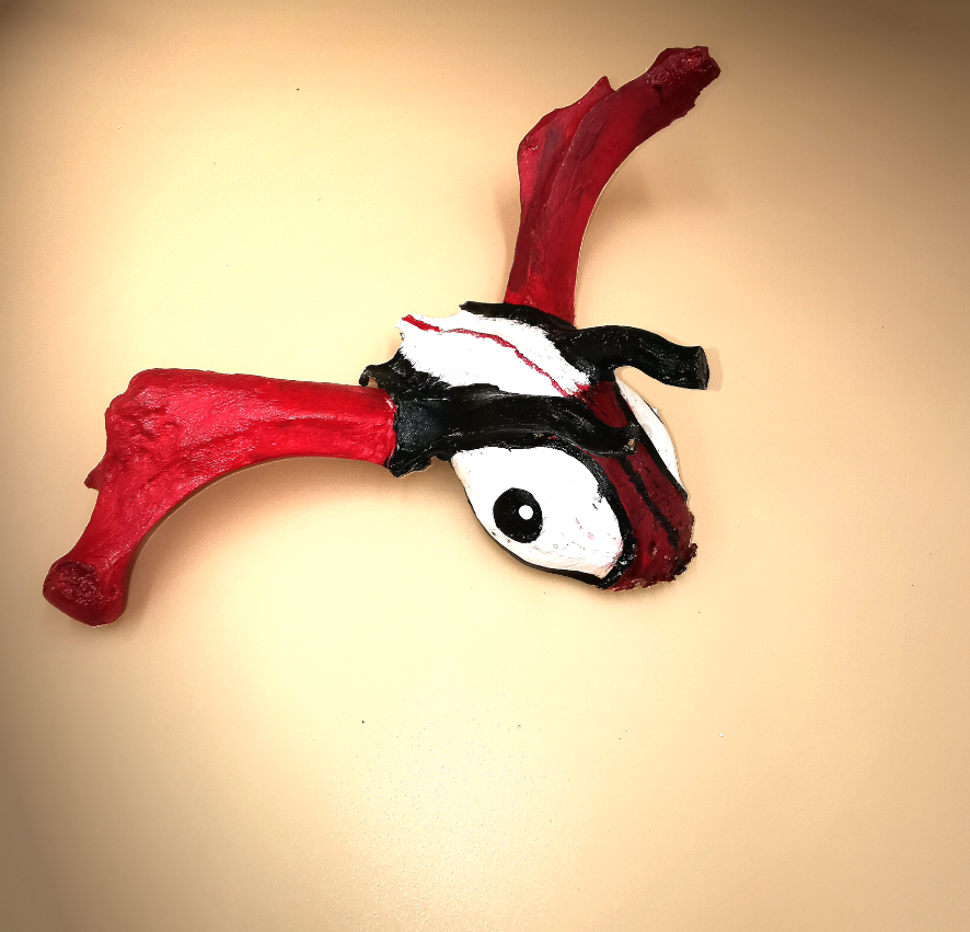Alberich ist ein originelles Objekt aus verschiedenen Knochenteilen, keine Trophäe, sondern ein außergewöhnliches Dekorationsobjekt für einen individuellen Einrichtungsstil. Alberich ist ein Rippnstickl welches durch seine freundlichen Farben und die großen Augen symphatisch wirkt.
