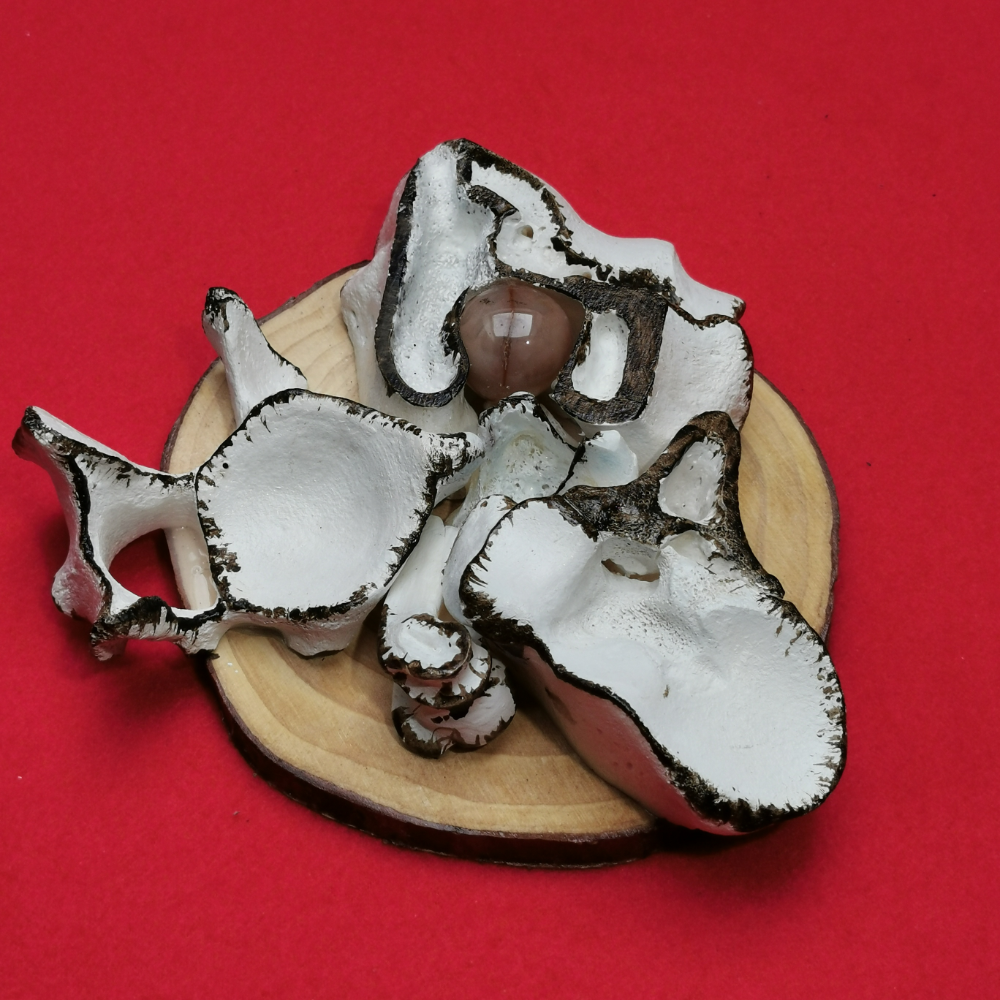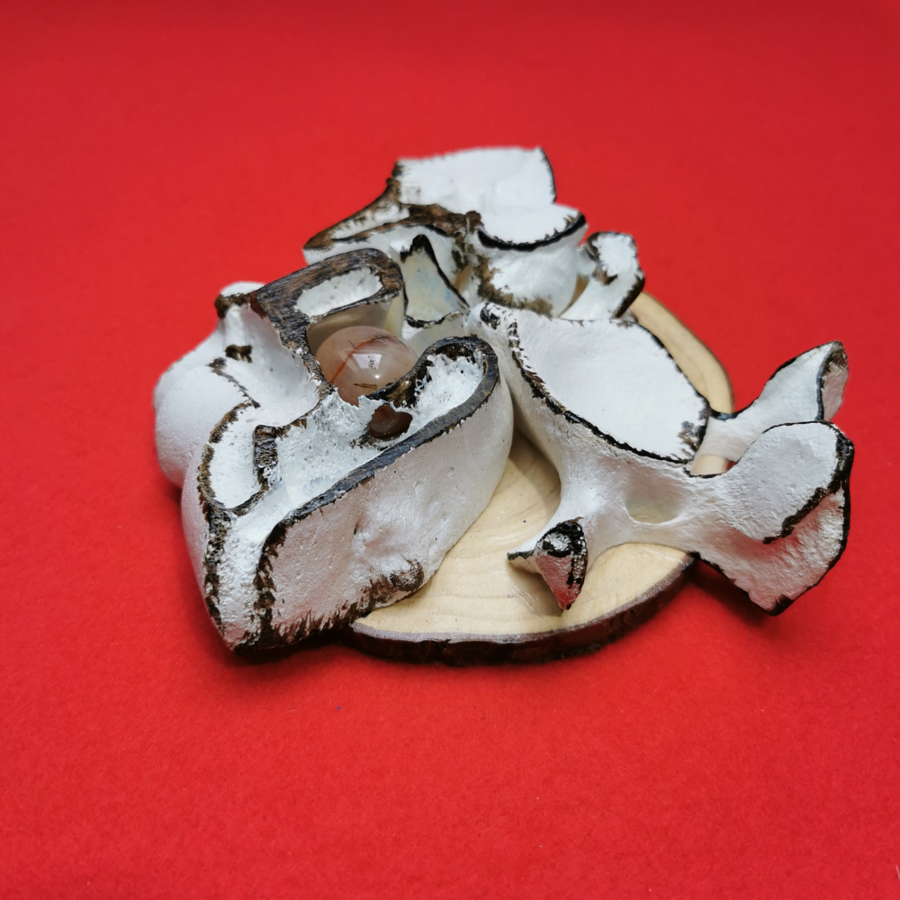 Drachennest ist ein Exponat aus einer Reihe, inspiriert haben mich dazu die Halbedelsteine, die wie Eier geformt sind. Farblich angepasst ist die Lackierung der Knochenfragmente, was in Kombination mit der Naturholzplatte ein harmonisches Bild ergibt. Du kannst dieses Rippnstickl auch als Kerzenständer verwenden, bitte die Kerze nur unter Aufsicht brennen lassen, um Brandgefahr zu vermeiden.