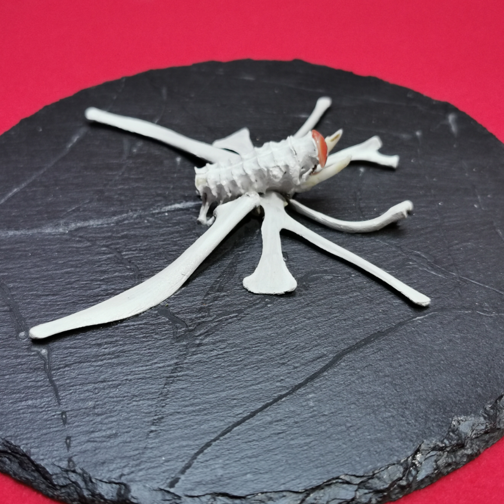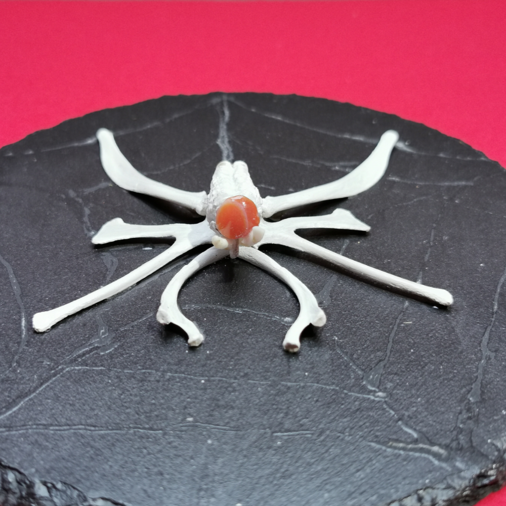 Nosferatu ist sicher nicht für alle Menschen schön, aber ich weiß, das auch Spinnen Freunde haben. Die Idee ist, wie viele Rippnstickl, zufällig bei der Bearbeitung der Knochen entstanden. Die verwendeten Knochen sind selten, deshalb sind meine Spinnen rar. Alle Teile sind mit Modellbaukleber auf der Schieferplatte befestigt.