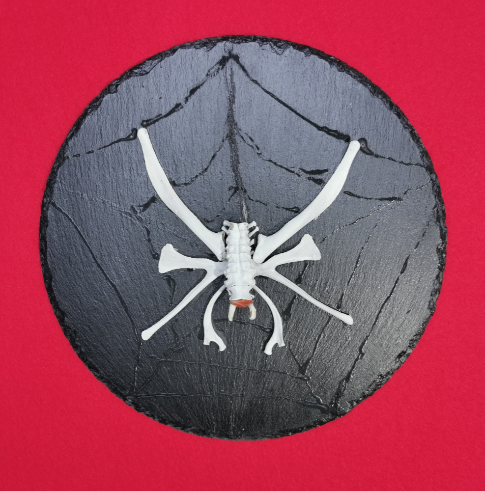 Spinne Nosferatu R 21 Kunstobjekt aus diversen Knochen auf Schieferplatte mit 20 cm Durchmesser.